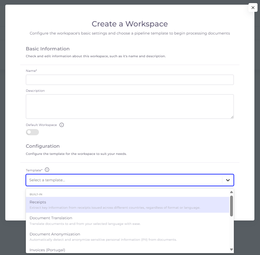 Regardless of how the user creates a workspace, the creation screen will always be the same in both scenarios: