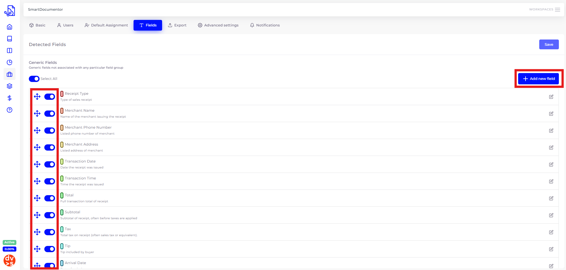 You can disable, reorder, or add new fields to the workspace. However, newly added fields are not automatically detected, as they fall outside the scope of the model’s trained field set. These fields will instead appear during the review phase, allowing the reviewer to fill them in manually.