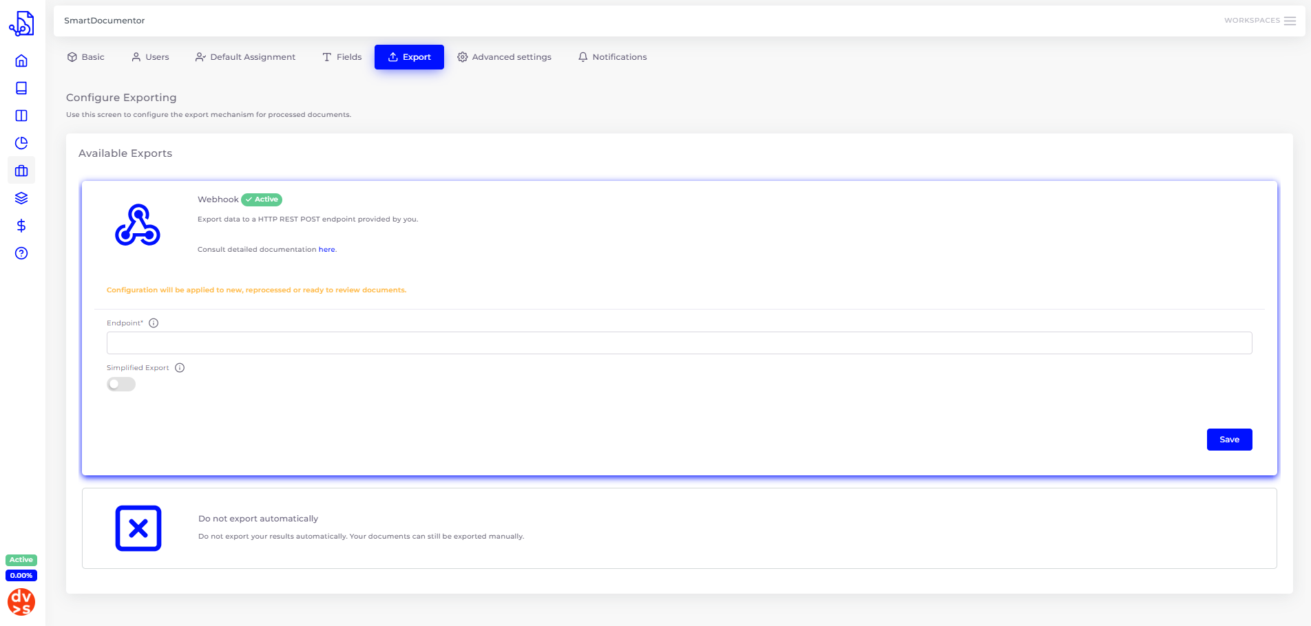 This section lets you configure SmartDocumentor’s automatic export mechanism, which can be triggered after the revision step is completed or once the document has been fully processed. SmartDocumentor uses webhooks to integrate seamlessly with most modern systems in a simple and efficient way.
