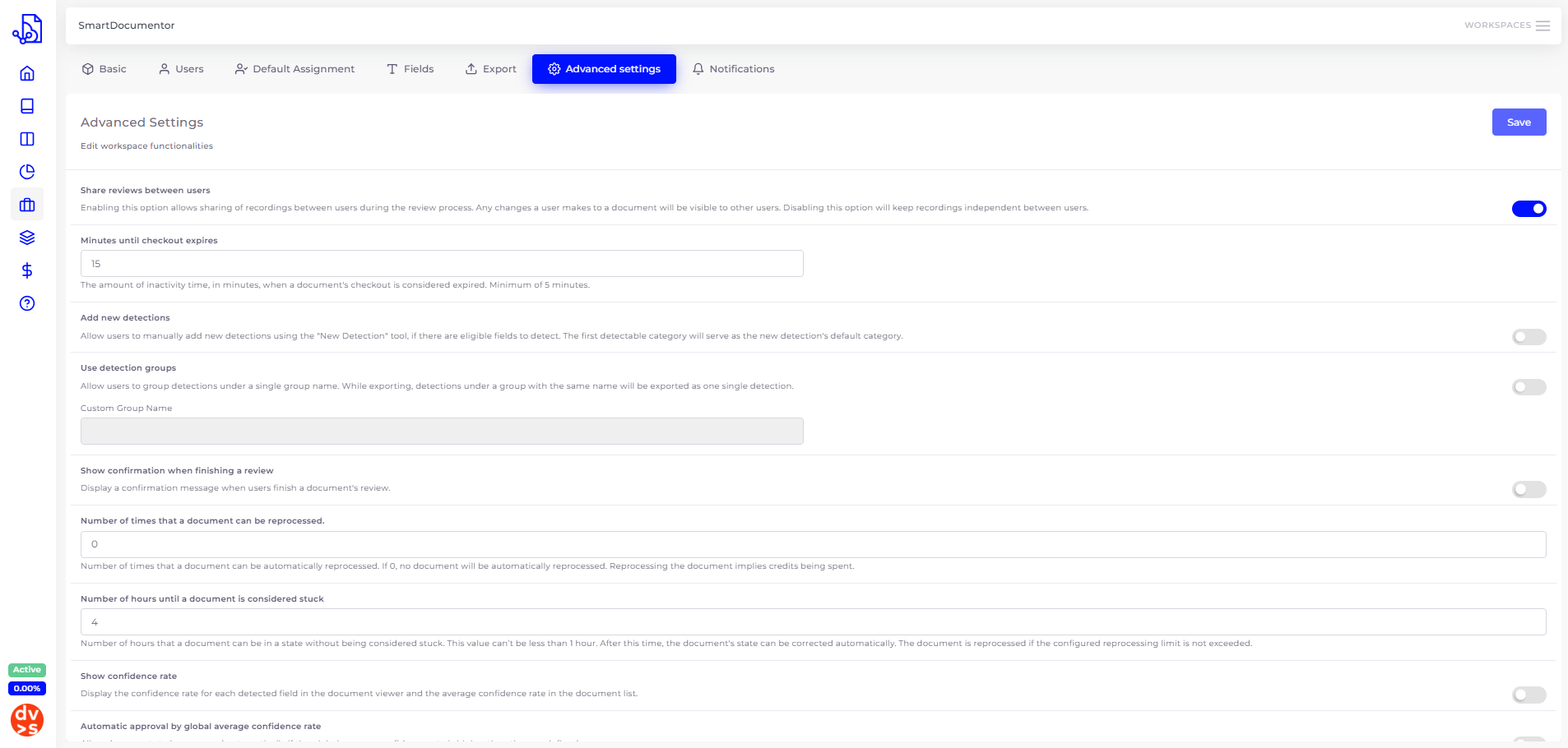 This section allows users to configure a wide range of workspace settings, including confirmation modal displays, confidence score visibility for field recognition, automatic approval based on average confidence, review mode preferences, workspace removal, and more.