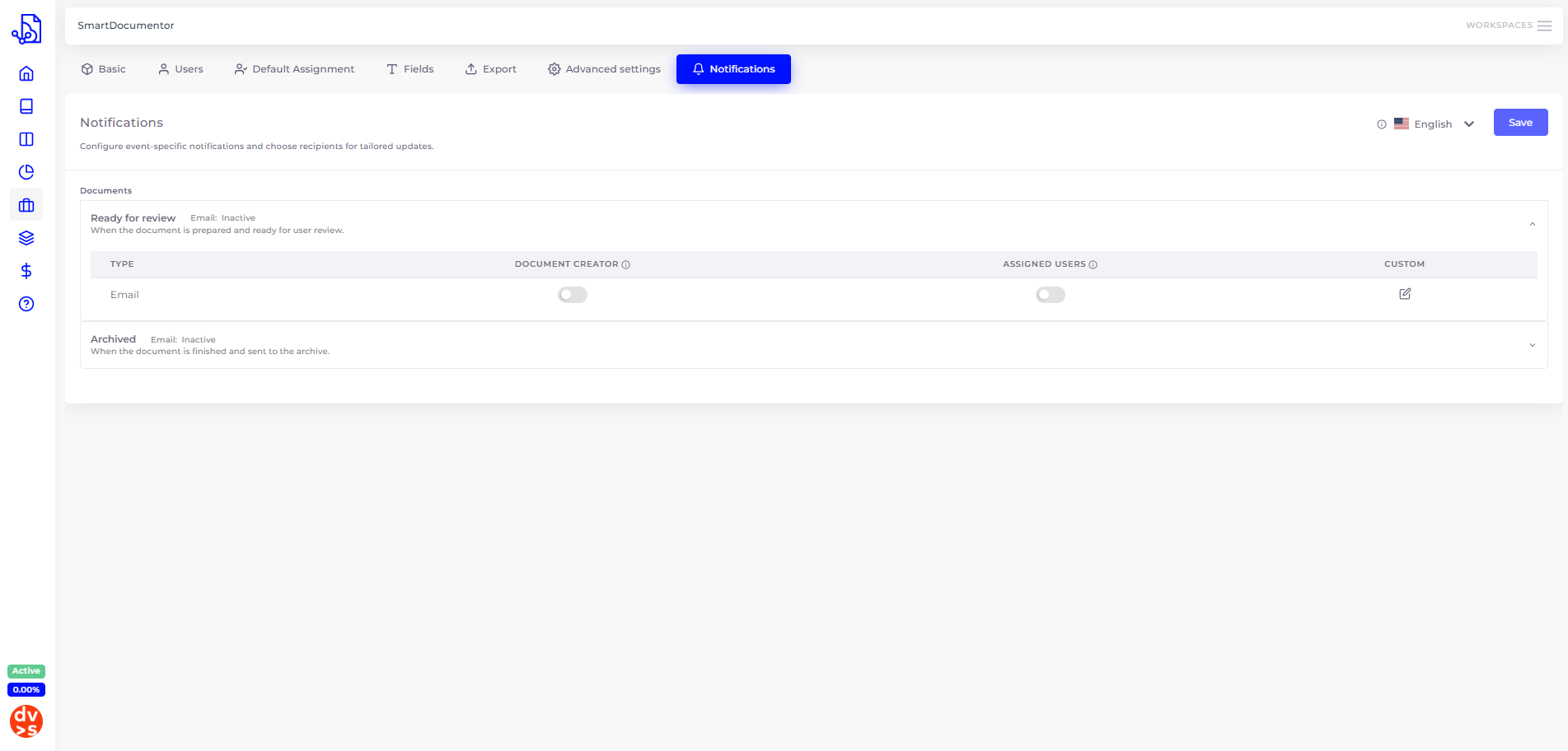 This section allows users to manage notification settings within the SmartDocumentor workflow. Notifications can be triggered at two key stages: when a document is ready for review and when it moves to archiving. By default, notifications are sent to the document’s creator and assigned reviewers. Additionally, any workspace members can be added as recipients using the custom option. You also have full control over the language used in the notification messages.