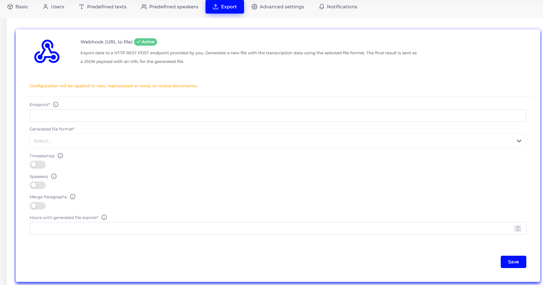 - Endpoint: a publicly available URL where SmartDocumentor can send notifications to. Notifications are sent as HTTP POST requests with the file content.